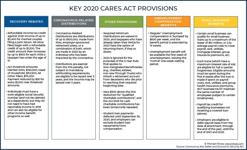 Coronavirus-Related Distributions from Retirement Accounts: People affected by COVID-19 may withdraw up to $100,000 in 2020 from a combination of IRAs or employer-sponsored retirement plans such as 401ks in 2020. You can qualify if you, your spouse or a dependent has been diagnosed with COVID-19; if you have been quarantined, furloughed, laid off or had your work hours reduced; are unable to work because you lack childcare as a result of the virus; own a business that closed or operated under reduced hours because of pandemic; or meet other IRS provisions. These distributions are exempt from the traditional 10% early withdrawal penalty. But the amount withdrawn must be repaid over three years. The withdrawals still count as taxable income, but the income can be spread out over three years.